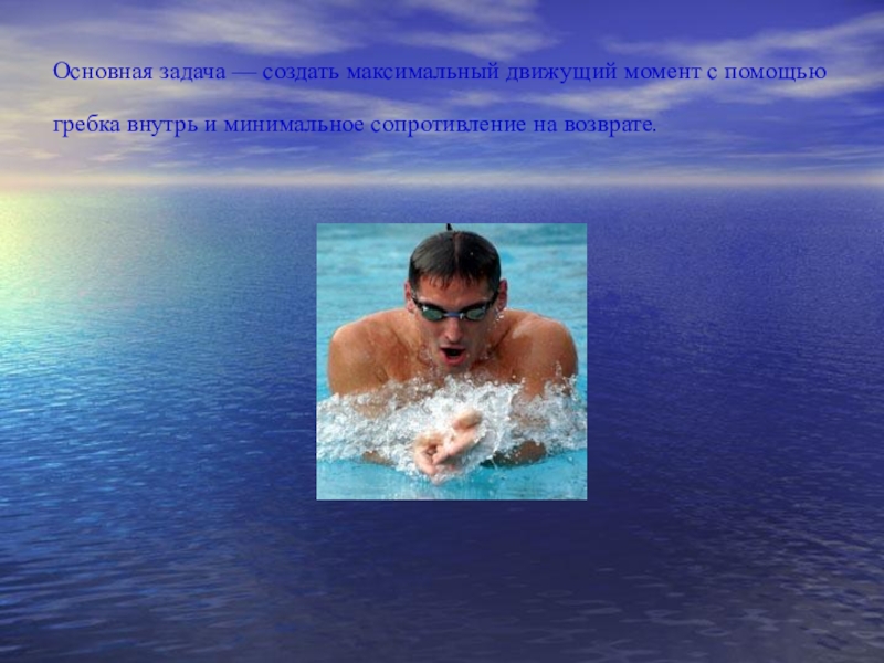 Слайд 5Основная задача — создать максимальный движущий момент с помощью гребка внутрь и