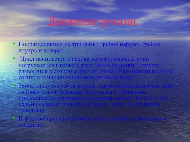 Движение руками.Подразделяются на три фазы: гребок наружу, гребок внутрь и возврат. Цикл начинается с гребка наружу: сначала
