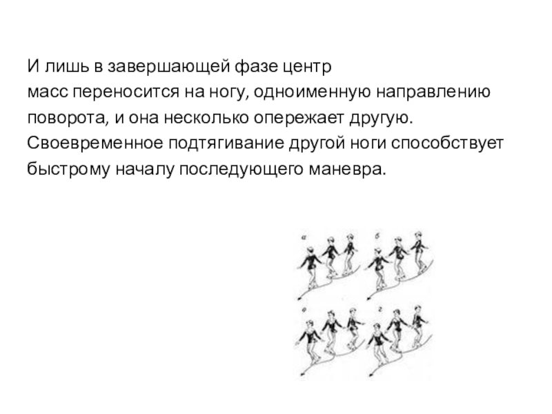 И лишь в завершающей фазе центрмасс переносится на ногу, одноименную направлениюповорота, и она несколько опережает другую.Своевременное подтягивание