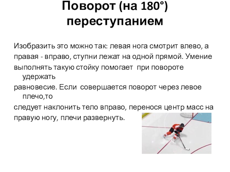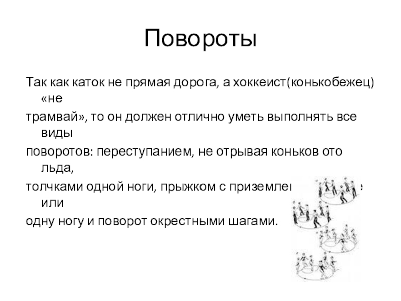 ПоворотыТак как каток не прямая дорога, а хоккеист(конькобежец) «нетрамвай», то он должен отлично уметь выполнять все видыповоротов: переступанием, не отрывая коньков ото льда,толчками одной ноги, прыжком с приземлением на две илиодну ногу и поворот окрестными шагами.
