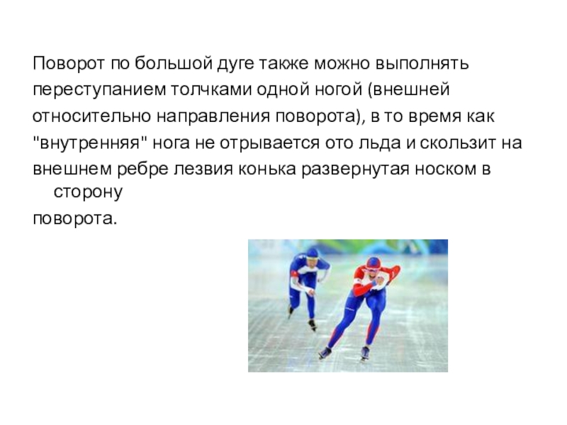 Поворот по большой дуге также можно выполнятьпереступанием толчками одной ногой (внешнейотносительно направления поворота), в то время как