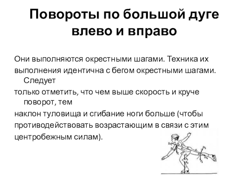 Повороты по большой дуге влево и вправо Они выполняются окрестными шагами. Техника ихвыполнения идентична с бегом окрестными