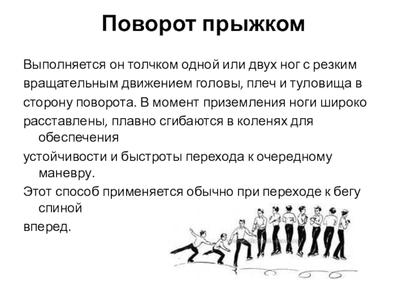 Поворот прыжком Выполняется он толчком одной или двух ног с резкимвращательным движением головы, плеч и туловища всторону