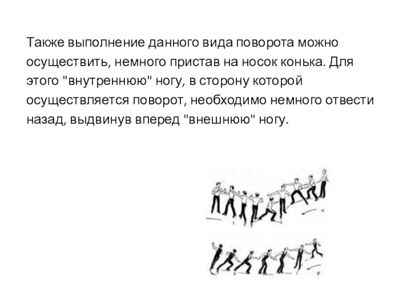 Также выполнение данного вида поворота можноосуществить, немного пристав на носок конька. Дляэтого