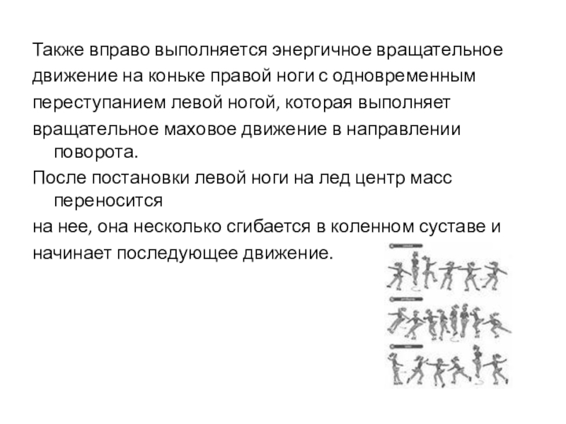 Также вправо выполняется энергичное вращательноедвижение на коньке правой ноги с одновременнымпереступанием левой ногой, которая выполняетвращательное маховое движение