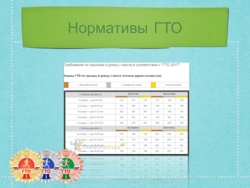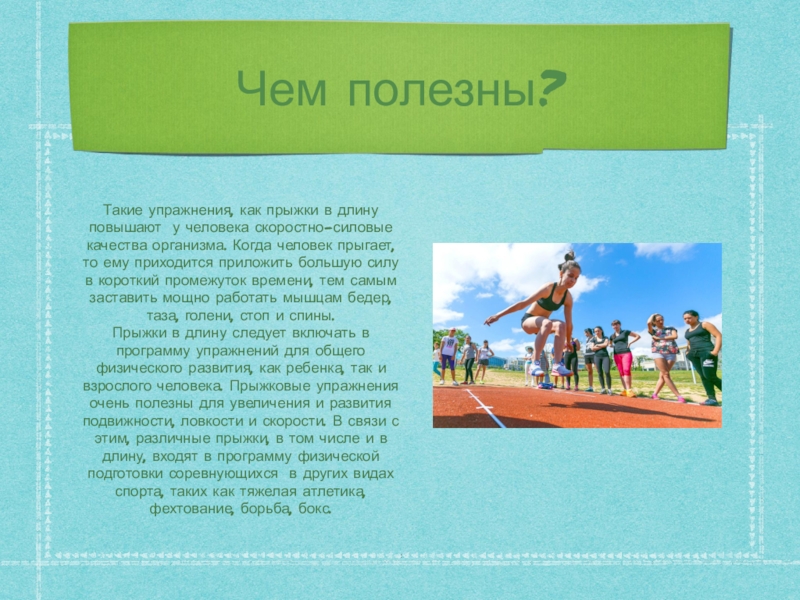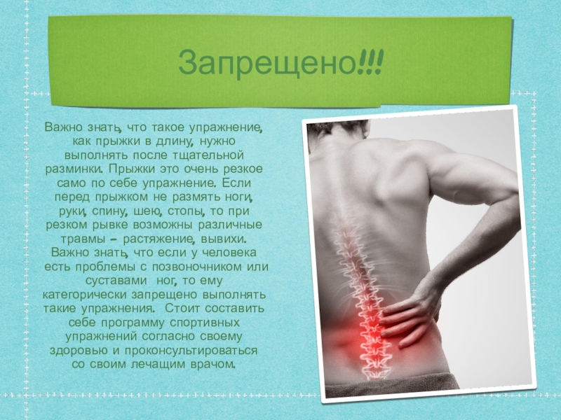 максимально сильный толчок. Для выполнения упражнения человек встает у линии, расставив ноги на ширине плеч или чуть уже, затем поднимает руки вверх, одновременно поднимаясь на носки и прогибаясь в пояснице. Затем следует обратное движение. Руки опускаются вниз и отводятся назад, ноги ставятся на всю стопу, при этом сгибаются колени и тазобедренный сустав, корпус выносится чуть вперед.