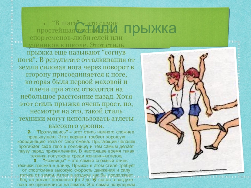 в школе. Этот стиль прыжка еще называют “согнув ноги”. В результате отталкивания от земли силовая нога через поворот в сторону присоединяется к ноге, которая была первой маховой и плечи при этом отводятся на небольшое расстояние назад. Хотя этот стиль прыжка очень прост, но, несмотря на это, такой стиль техники могут использовать атлеты высокого уровня.