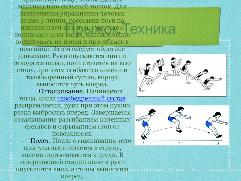 Подготовка к отталкиваниюНа данном этапе спортсмен принимает правильную позу, чтобы сделать максимально сильный толчок. Для выполнения упражнения