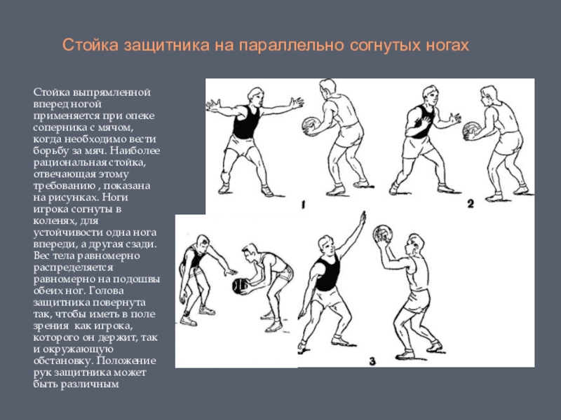 опеке соперника с мячом, когда необходимо вести борьбу за мяч. Наиболее рациональная стойка, отвечающая этому требованию , показана на рисунках. Ноги игрока согнуты в коленях, для устойчивости одна нога впереди, а другая сзади. Вес тела равномерно распределяется равномерно на подошвы обеих ног. Голова защитника повернута так, чтобы иметь в поле зрения как игрока, которого он держит, так и окружающую обстановку. Положение рук защитника может быть различным
