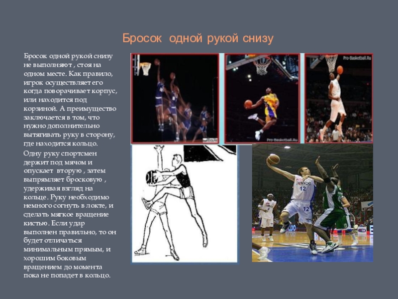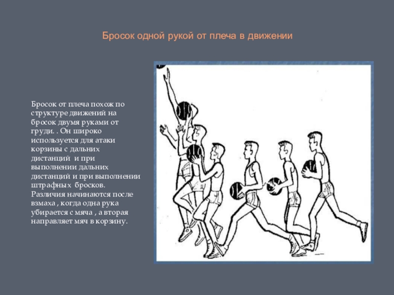 структуре движений на бросок двумя руками от груди. . Он широко используется для атаки корзины с дальних дистанций и при выполнении дальних дистанций и при выполнении штрафных бросков. Различия начинаются после взмаха , когда одна рука убирается с мяча , а вторая направляет мяч в корзину.