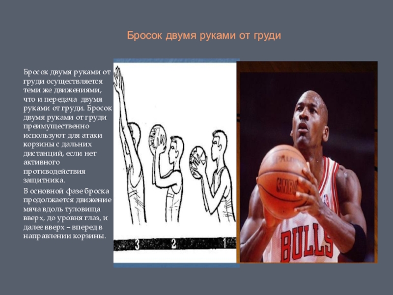 же движениями, что и передача двумя руками от груди. Бросок двумя руками от груди преимущественно используют для атаки корзины с дальних дистанций, если нет активного противодействия защитника.