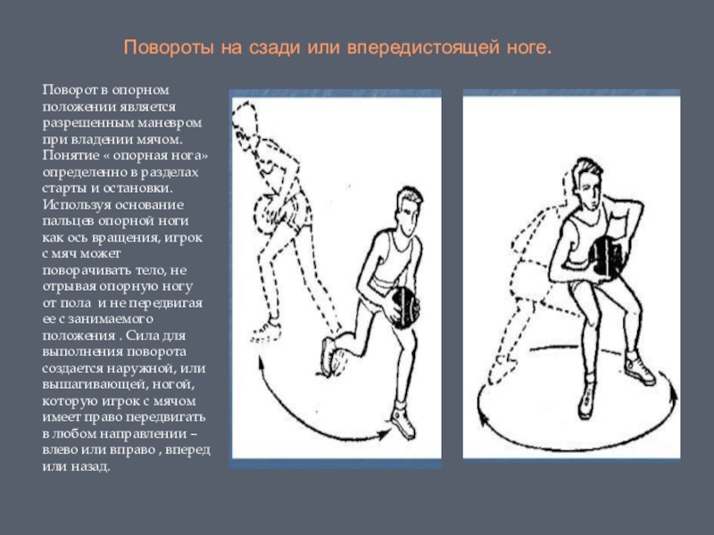 маневром при владении мячом. Понятие « опорная нога» определенно в разделах старты и остановки. Используя основание пальцев опорной ноги как ось вращения, игрок с мяч может поворачивать тело, не отрывая опорную ногу от пола и не передвигая ее с занимаемого положения . Сила для выполнения поворота создается наружной, или вышагивающей, ногой, которую игрок с мячом имеет право передвигать в любом направлении – влево или вправо , вперед или назад.