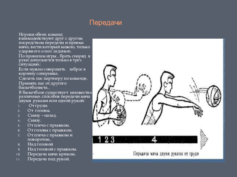 В баскетболе существует множество различных способов передачи мяча двумя руками или одной рукой: