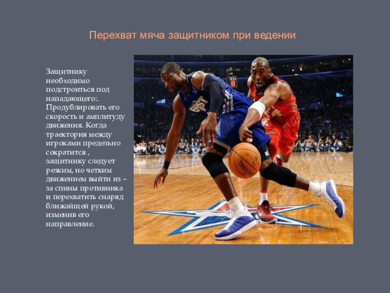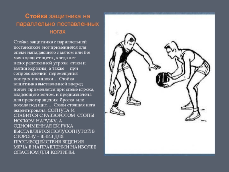 применяется для опеки нападающего с мячом или без мяча дали от щита , когда нет непосредственной угрозы атаки и взятия корзины, а также при сопровождении перемещения поперек площадки… Стойка защитника выставленной вперед ногой применяется при опеке игрока, владеющего мячом, и предназначена для предотвращения броска или похода под щит…. Сзади стоящая нога акцентирована. СОГНУТА И СТАВИТСЯ С РАЗВОРОТОМ СТОПЫ НОСКОМ НАРУЖУ, А ОДНОИМЕННАЯ ЕЙ РУКА ВЫСТАВЛЯЕТСЯ ПОЛУСОГНУТОЙ В СТОРОНУ – ВНИЗ ДЛЯ ПРОТИВОДЕЙСТВИЯ ВЕДЕНИЯ МЯЧА В НАПРАВЛЕНИИ НАИБОЛЕЕ ОПАСНОМ ДЛЯ КОРЗИНЫ.