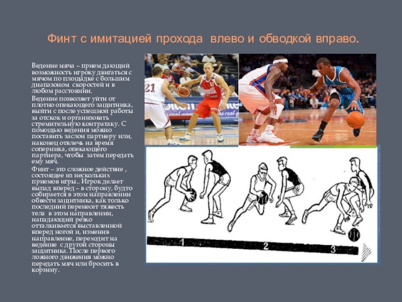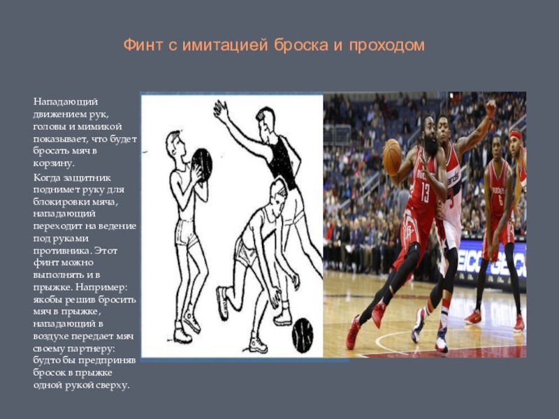 Финт – это сложное действие , состоящее из нескольких приемов игры.. Игрок делает выпад вперед – в сторону, будто собирается в этом направлении обвести защитника, как только последний перенесет тяжесть тела в этом направлении, нападающий резко отталкивается выставленной вперед ногой и, изменив направление, переходит на ведение с другой стороны защитника. После первого ложного движения можно передать мяч или бросить в корзину.