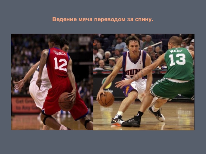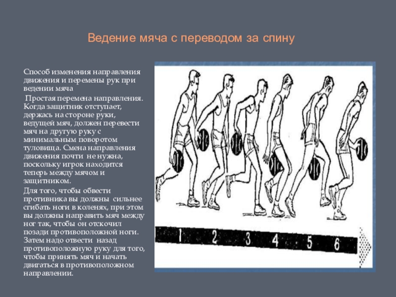 Простая перемена направления. Когда защитник отступает, держась на стороне руки, ведущей мяч, должен перевести мяч на другую руку с минимальным поворотом туловища. Смена направления движения почти не нужна, поскольку игрок находится теперь между мячом и защитником.