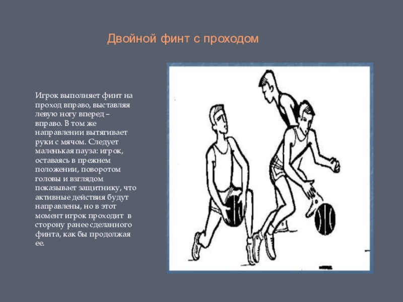 ногу вперед – вправо. В том же направлении вытягивает руки с мячом. Следует маленькая пауза: игрок, оставаясь в прежнем положении, поворотом головы и взглядом показывает защитнику, что активные действия будут направлены, но в этот момент игрок проходит в сторону ранее сделанного финта, как бы продолжая ее.