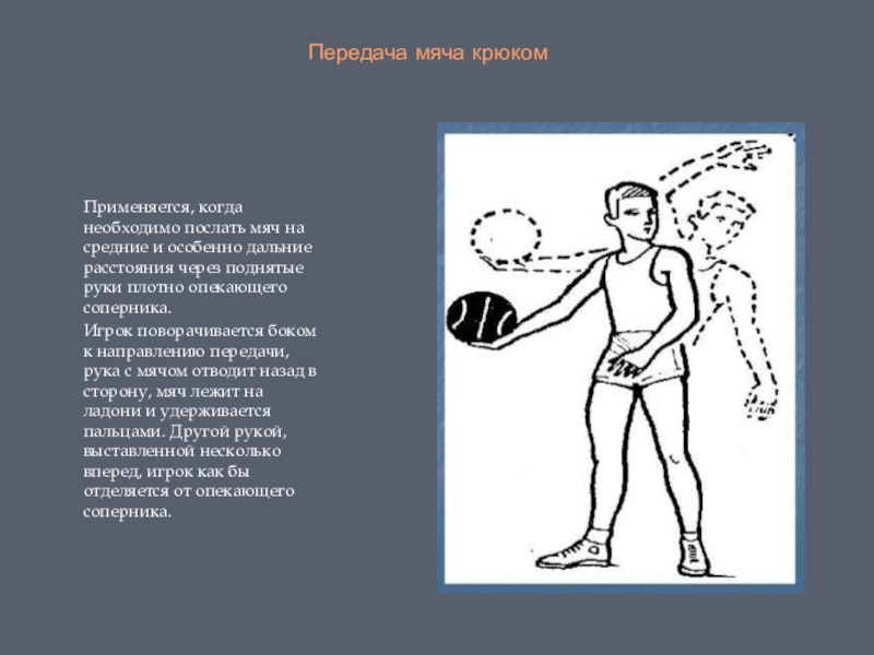 Игрок поворачивается боком к направлению передачи, рука с мячом отводит назад в сторону, мяч лежит на ладони и удерживается пальцами. Другой рукой, выставленной несколько вперед, игрок как бы отделяется от опекающего соперника.