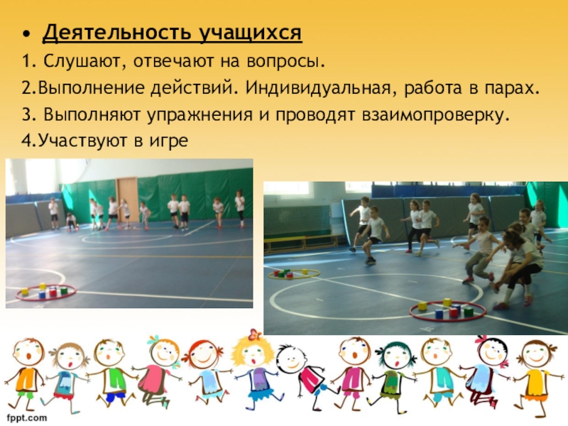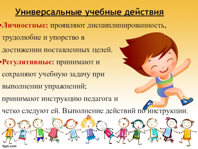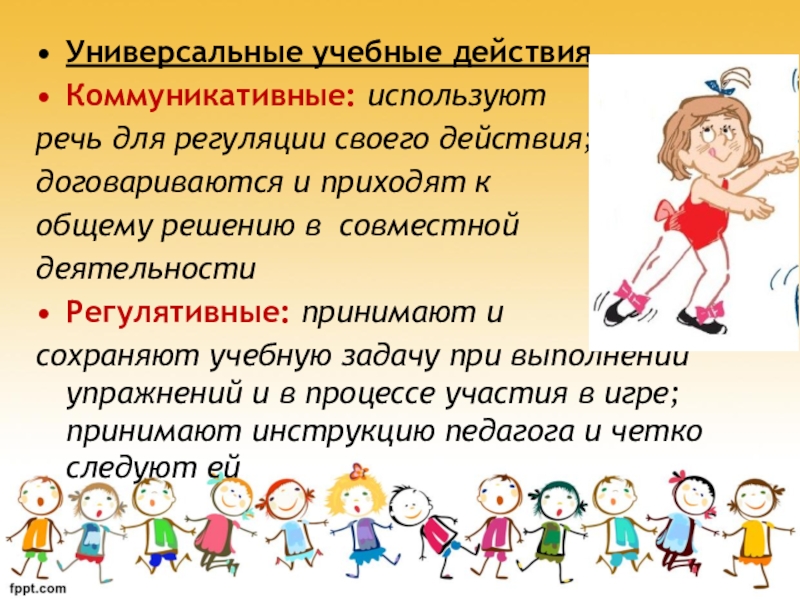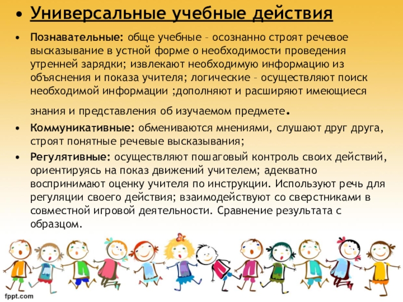 Регулятивные: осуществляют пошаговый контроль своих действий, ориентируясь на показ движений учителем; адекватно воспринимают оценку учителя по инструкции. Используют речь для регуляции своего действия; взаимодействуют со сверстниками в совместной игровой деятельности. Сравнение результата с образцом.