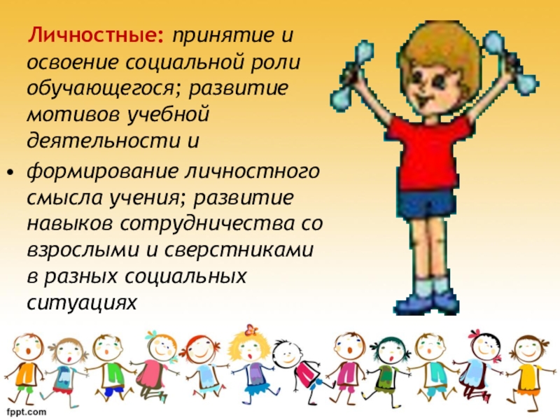 Слайд 5 Личностные: принятие и освоение социальной роли обучающегося; развитие мотивов
