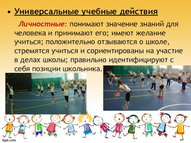 человека и принимают его; имеют желание учиться; положительно отзываются о школе, стремятся учиться и сориентированы на участие в делах школы; правильно идентифицируют с себя позиции школьника.