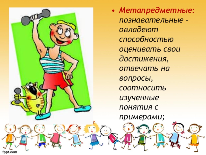 Слайд 2Планируемые образовательные результаты: Предметные: научатся: представлять физическую культуру как средство укрепления