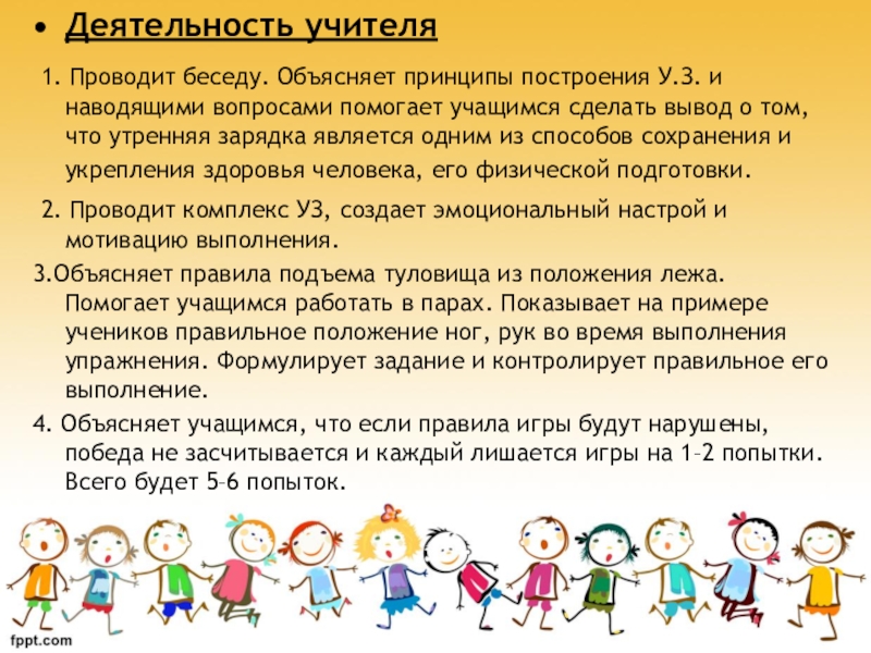 3.Объясняет правила подъема туловища из положения лежа. Помогает учащимся работать в парах. Показывает на примере учеников правильное положение ног, рук во время выполнения упражнения. Формулирует задание и контролирует правильное его выполнение.