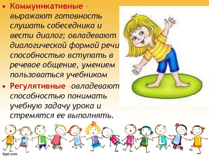 Слайд 4Коммуникативные – выражают готовность слушать собеседника и вести диалог; овладевают диалогической