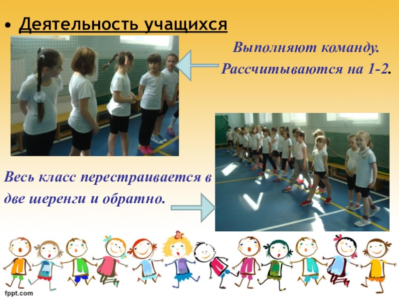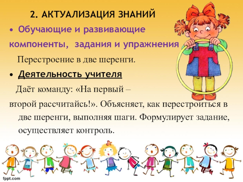 второй рассчитайсь!». Объясняет, как перестроиться в две шеренги, выполняя шаги. Формулирует задание, осуществляет контроль.