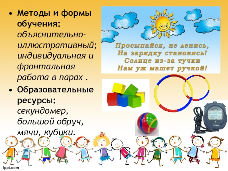 Образовательные ресурсы: секундомер, большой обруч, мячи, кубики.