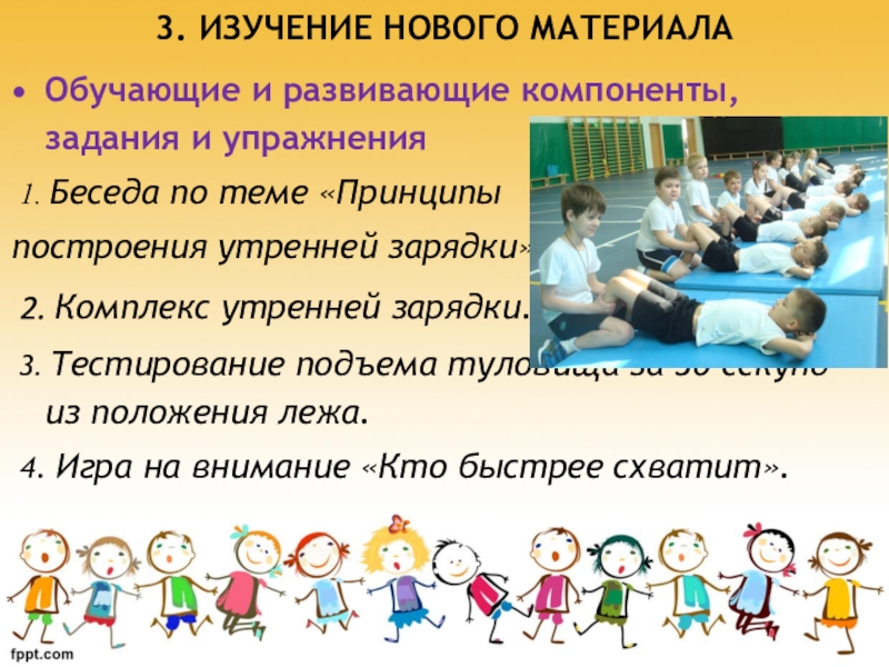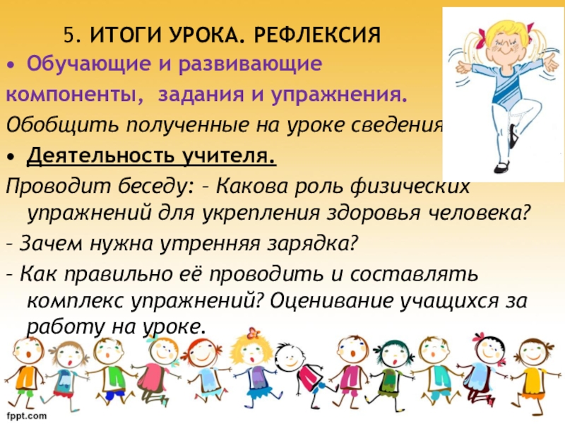 построения У.З. и наводящими вопросами помогает учащимся сделать вывод о том, что утренняя зарядка является одним из способов сохранения и укрепления здоровья человека, его физической подготовки.