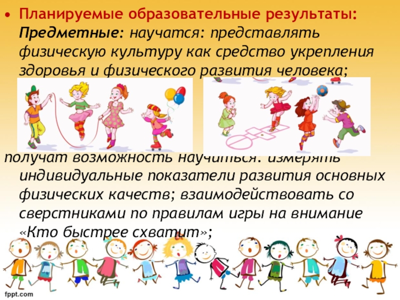 получат возможность научиться: измерять индивидуальные показатели развития основных физических качеств; взаимодействовать со сверстниками по правилам игры на внимание «Кто быстрее схватит»;