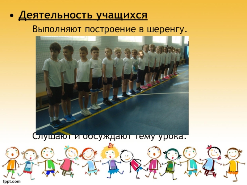 в шеренгу. Проверяет готовность к уроку, озвучивает тему и цель урока: создает эмоциональный настрой на изучение новой темы.