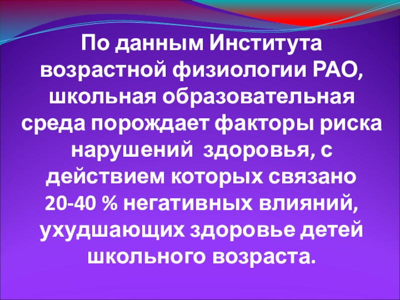 Слайд 3По данным Института возрастной физиологии РАО, школьная образовательная среда порождает факторы