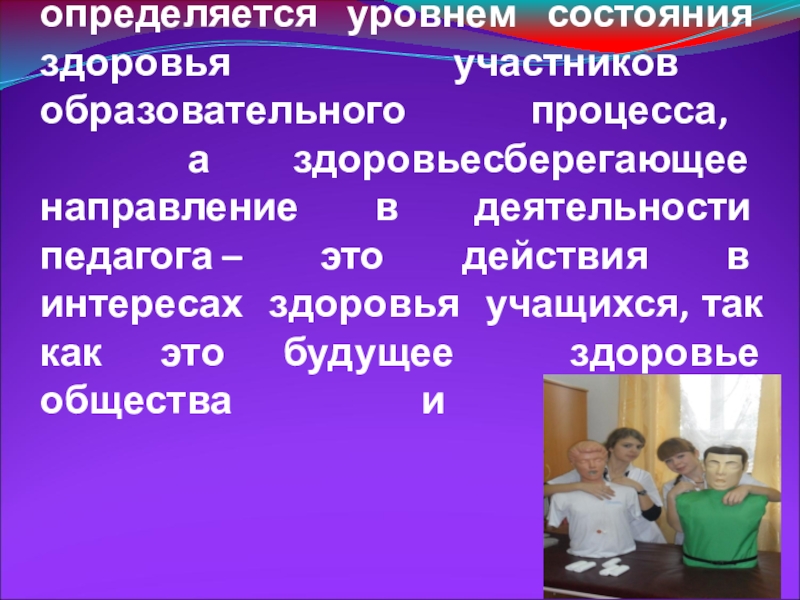 а здоровьесберегающее направление в деятельности педагога – это действия в интересах здоровья учащихся, так как это будущее здоровье общества и нации.