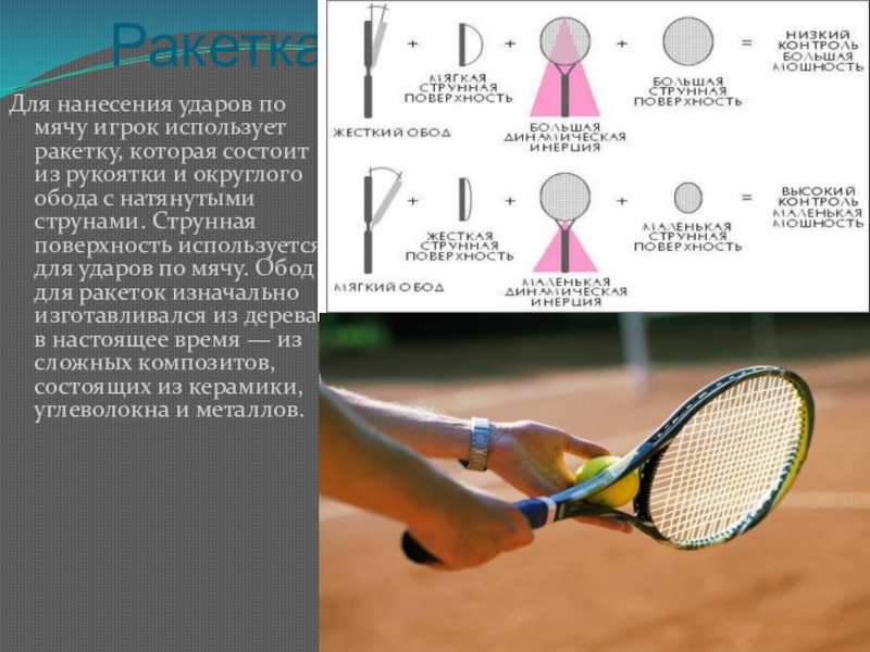 рукоятки и округлого обода с натянутыми струнами. Струнная поверхность используется для ударов по мячу. Обод для ракеток изначально изготавливался из дерева, в настоящее время — из сложных композитов, состоящих из керамики, углеволокна и металлов.
