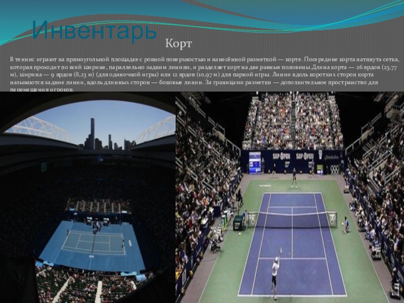 разметкой — корте. Посередине корта натянута сетка, которая проходит по всей ширине, параллельно задним линиям, и разделяет корт на две равные половины.Длина корта — 26 ярдов (23,77 м), ширина — 9 ярдов (8,23 м) (для одиночной игры) или 12 ярдов (10,97 м) для парной игры. Линии вдоль коротких сторон корта называются задние линии, вдоль длинных сторон — боковые линии. За границами разметки — дополнительное пространство для перемещения игроков.
