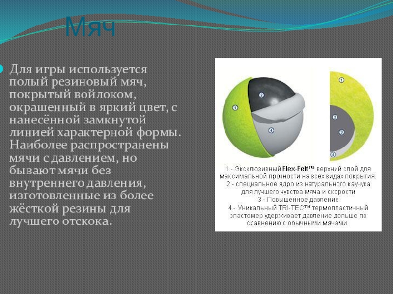 цвет, с нанесённой замкнутой линией характерной формы. Наиболее распространены мячи с давлением, но бывают мячи без внутреннего давления, изготовленные из более жёсткой резины для лучшего отскока.