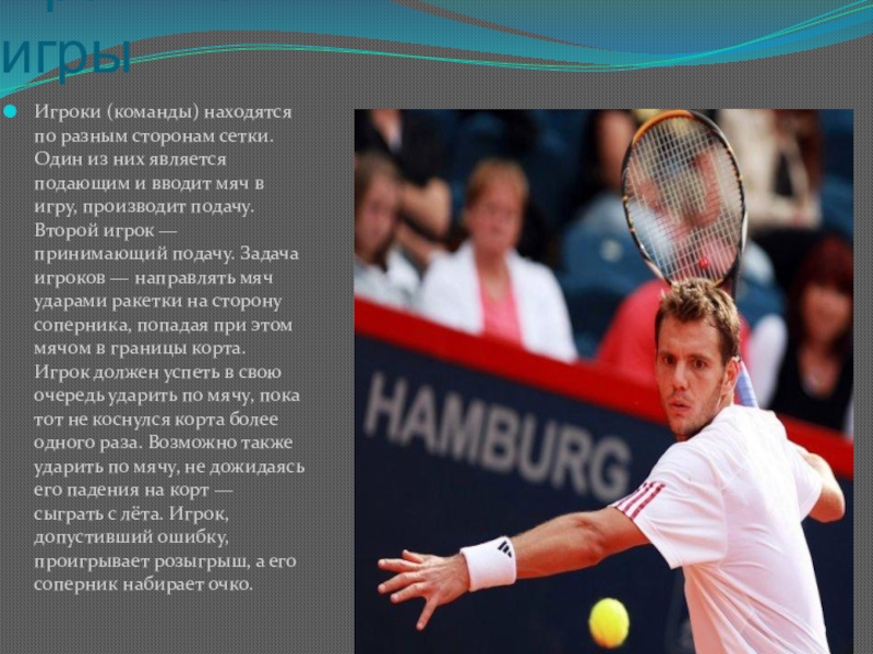 является подающим и вводит мяч в игру, производит подачу. Второй игрок — принимающий подачу. Задача игроков — направлять мяч ударами ракетки на сторону соперника, попадая при этом мячом в границы корта. Игрок должен успеть в свою очередь ударить по мячу, пока тот не коснулся корта более одного раза. Возможно также ударить по мячу, не дожидаясь его падения на корт — сыграть с лёта. Игрок, допустивший ошибку, проигрывает розыгрыш, а его соперник набирает очко.