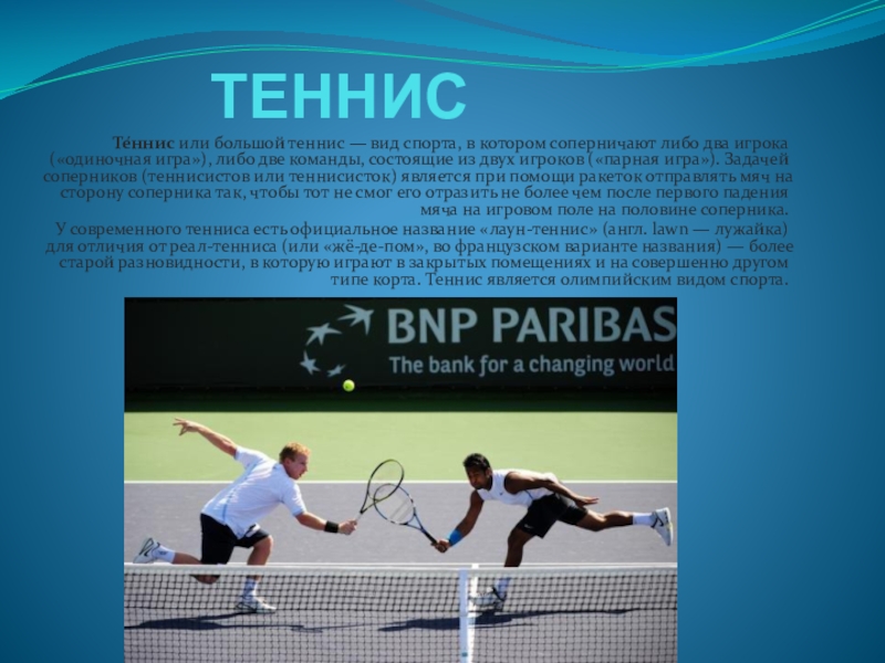 Те́ннис или большой теннис — вид спорта, в котором соперничают либо