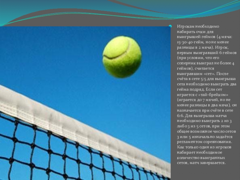 Слайд 10Игрокам необходимо набирать очки для выигрышей геймов (4 мяча: 15-30-40-гейм, но