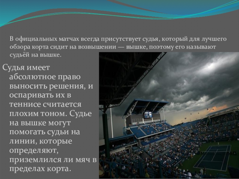 Слайд 11Судья имеет абсолютное право выносить решения, и оспаривать их в теннисе