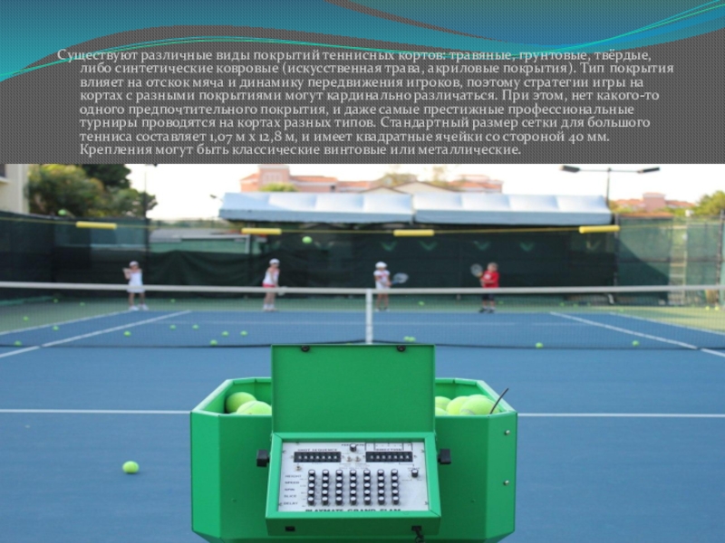 ковровые (искусственная трава, акриловые покрытия). Тип покрытия влияет на отскок мяча и динамику передвижения игроков, поэтому стратегии игры на кортах с разными покрытиями могут кардинально различаться. При этом, нет какого-то одного предпочтительного покрытия, и даже самые престижные профессиональные турниры проводятся на кортах разных типов. Стандартный размер сетки для большого тенниса составляет 1,07 м х 12,8 м, и имеет квадратные ячейки со стороной 40 мм. Крепления могут быть классические винтовые или металлические.