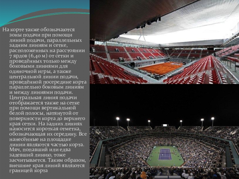 Слайд 4На корте также обозначаются зоны подачи при помощи линий подачи, параллельных