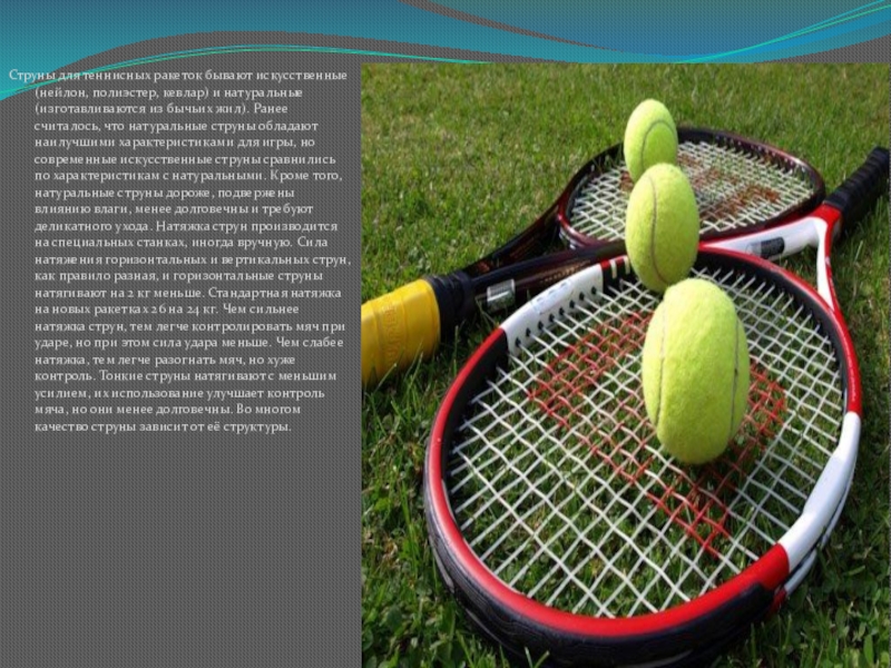Слайд 7Струны для теннисных ракеток бывают искусственные (нейлон, полиэстер, кевлар) и натуральные