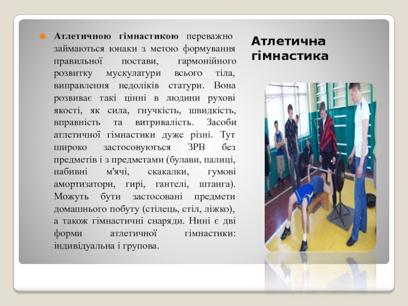 Атлетичною гімнастикою переважно займаються юнаки з метою формування правильної постави,