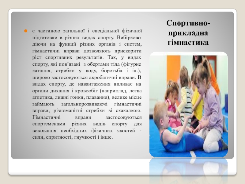 спорту. Вибірково діючи на функції різних органів і систем, гімнастичні вправи дозволяють прискорити ріст спортивних результатів. Так, у видах спорту, які пов’язані з обертами тіла (фігурне катання, стрибки у воду, боротьба і ін.), широко застосовуються акробатичні вправи. В видах спорту, де навантаження впливає на органи дихання і кровообіг (наприклад, легка атлетика, лижні гонки, плавання), велике місце займають загальнорозвиваючі гімнастичні вправи, різноманітні стрибки зі скакалкою. Гімнастичні вправи застосовуються спортсменами різних видів спорту для виховання необхідних фізичних якостей - сили, спритності, гнучкості і інше.