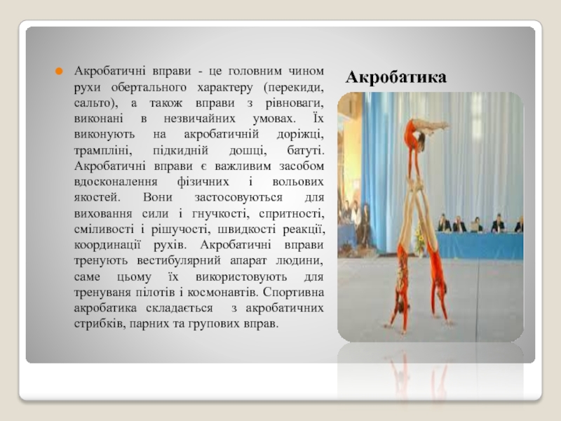 а також вправи з рівноваги, виконані в незвичайних умовах. Їх виконують на акробатичній доріжці, трампліні, підкидній дошці, батуті. Акробатичні вправи є важливим засобом вдосконалення фізичних і вольових якостей. Вони застосовуються для виховання сили і гнучкості, спритності, сміливості і рішучості, швидкості реакції, координації рухів. Акробатичні вправи тренують вестибулярний апарат людини, саме цьому їх використовують для тренуваня пілотів і космонавтів. Спортивна акробатика складається з акробатичних стрибків, парних та групових вправ.