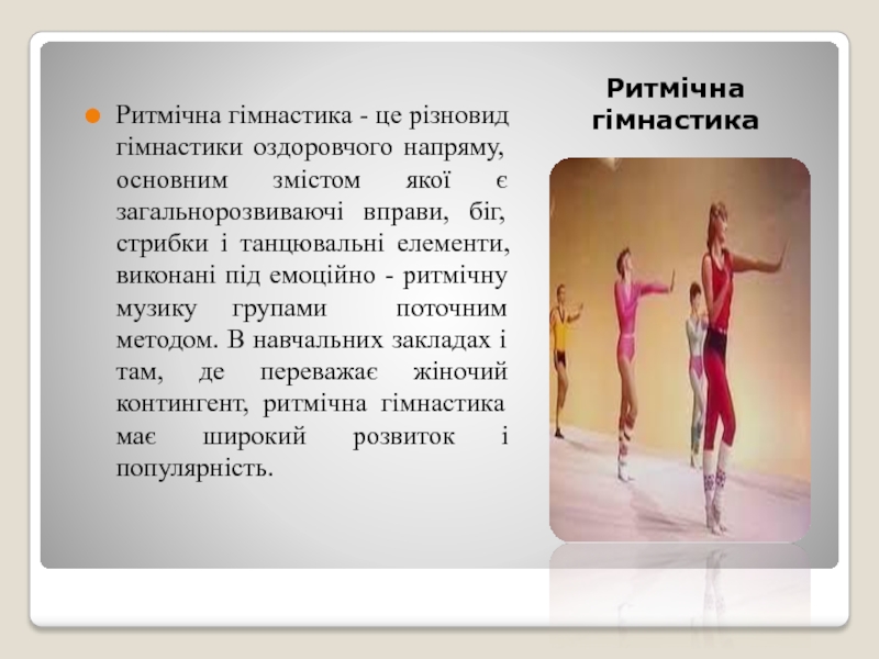 Ритмічна гімнастика - це різновид гімнастики оздоровчого напряму, основним змістом