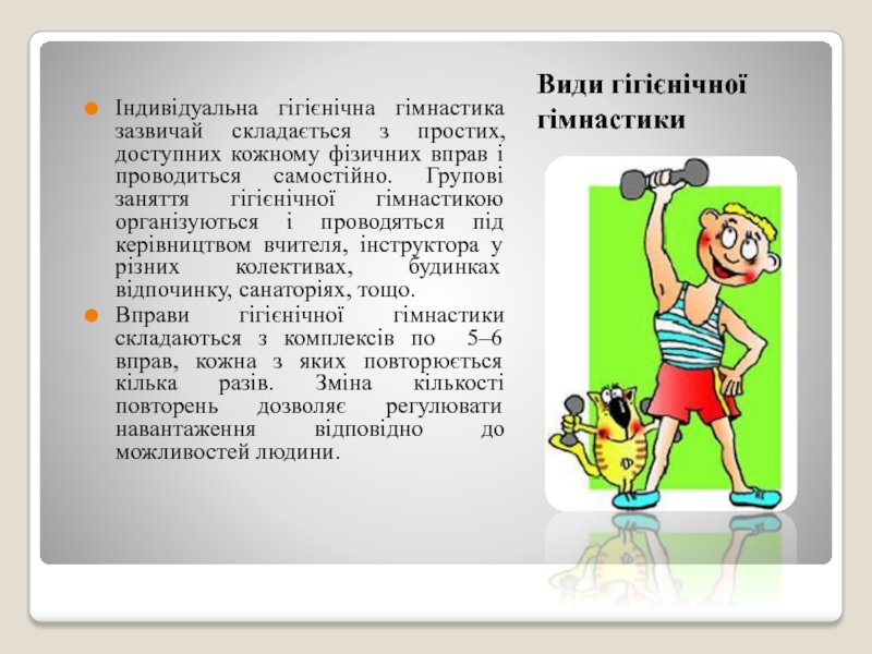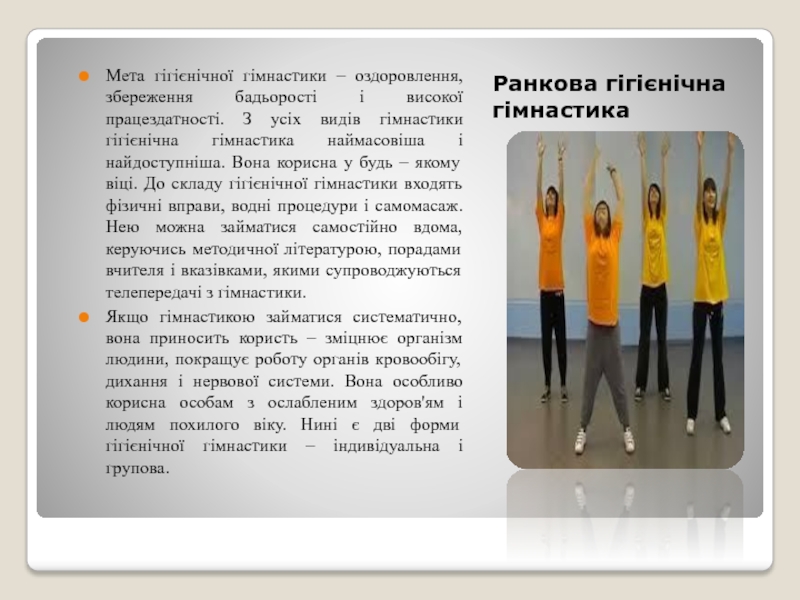 фізичних вправ і проводиться самостійно. Групові заняття гігієнічної гімнастикою організуються і проводяться під керівництвом вчителя, інструктора у різних колективах, будинках відпочинку, санаторіях, тощо.